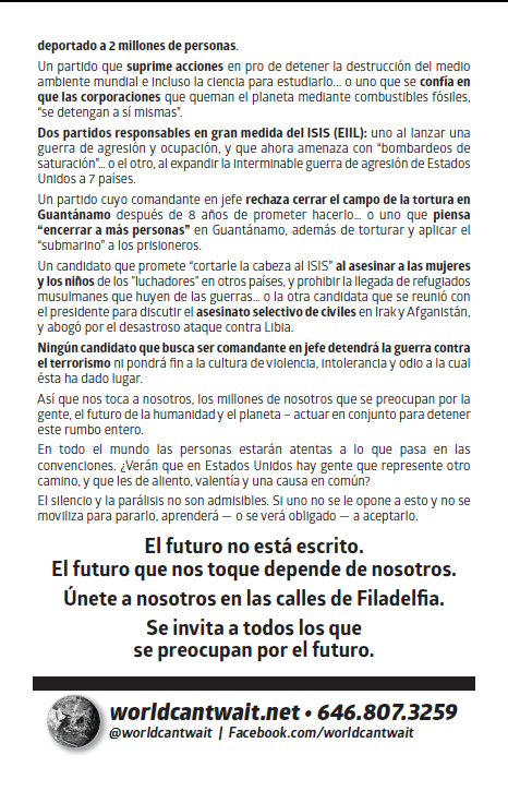 El Mundo no Puede Esperar moviliza a las personas que viven en Estados Unidos a repudiar y parar la guerra contra el mundo y también la represión y la tortura llevadas a cabo por el gobierno estadounidense. Actuamos, sin importar el partido político que esté en el poder, para denunciar los crímenes de nuestro gobierno, sean los crímenes de guerra o la sistemática encarcelación en masas, y para anteponer la humanidad y el planeta.