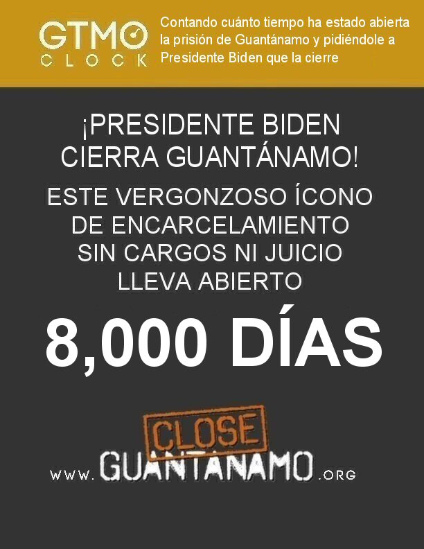 El cartel está aquí: http://www.worldcantwait-la.com/flyers/8500-gtmo-clock-sp.pdf https://gtmoclock.com/posters/GTMO-Clock-8500.pdf