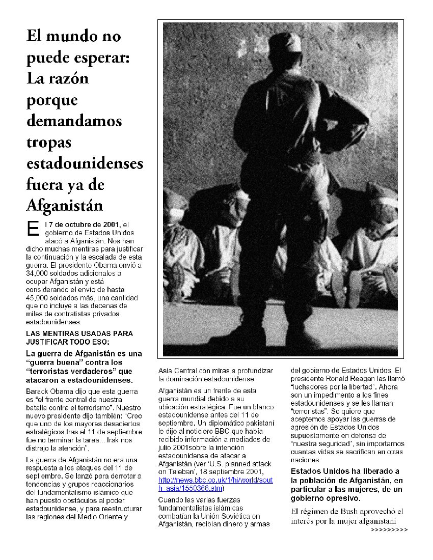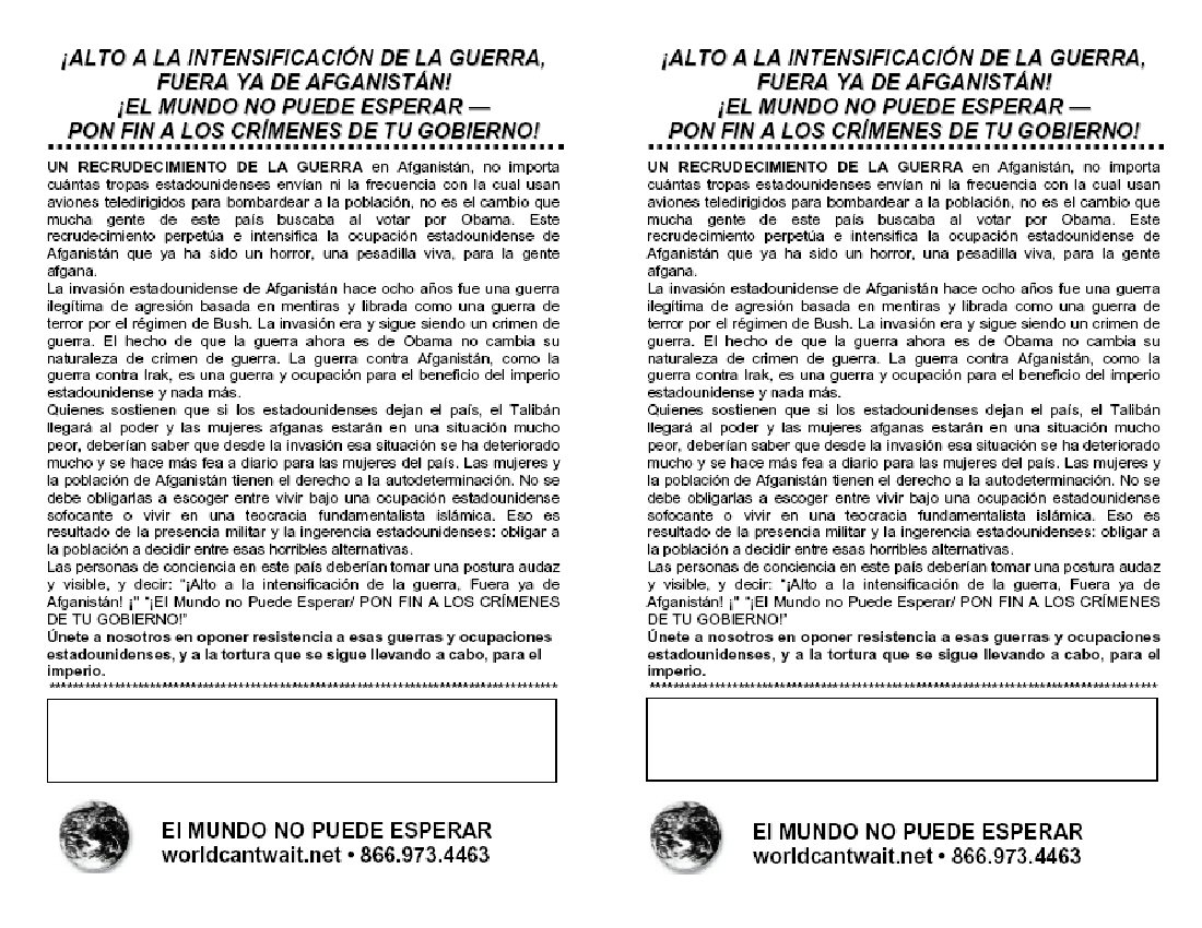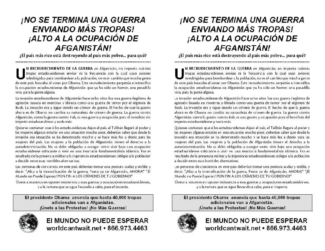 ALTO A LA INTENSIFICACIÓN DE LA GUERRA, FUERA YA DE AFGANISTÁN! ¡EL MUNDO NO PUEDE ESPERAR — PON FIN