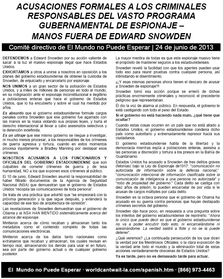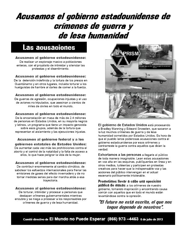 Clic para aquí Volante nacional (pdf) Comité directivo de El Mundo no Puede Esperar | 6 de julio de 2013 Traducido del inglés por El Mundo No Puede Esperar 8 de julio de 2013 El gobierno de Estados Unidos está procesando a Bradley Manning y Edward Snowden, que sacaron a la luz muchos crímenes de guerra y de lesa humanidad cometidos por Estados Unidos. Es hora de que el pueblo lance poderosas acusaciones contra el gobierno estadounidense por esos crímenes y contrarreste la guerra contra aquellos que dicen la verdad. Exhortamos a las personas a llegarle al público de toda manera imaginable. Lean estas acusaciones en voz alta en las esquinas, publíquenlas en línea y en otros medios, tuitéenlas y participen en protestas creativas para hacer que la indispensable voz y las acciones del público intervengan en el actual escenario políticamente intolerable. DECIR LA VERDAD NO ES UN CRIMEN