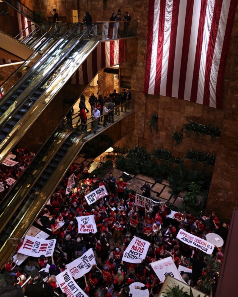 Jewish Voice for Peace dentro de la Torre Trump exigiendo la liberación