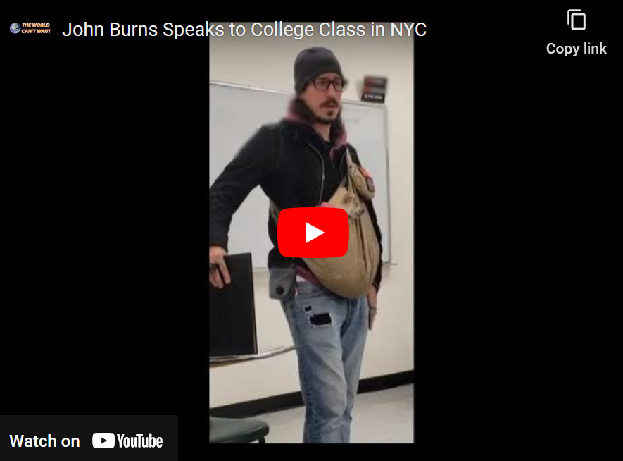 Vea a John Burns, presentador de We Are Not Your Soldiers, hablando con los alumnos de una clase universitaria de Nueva