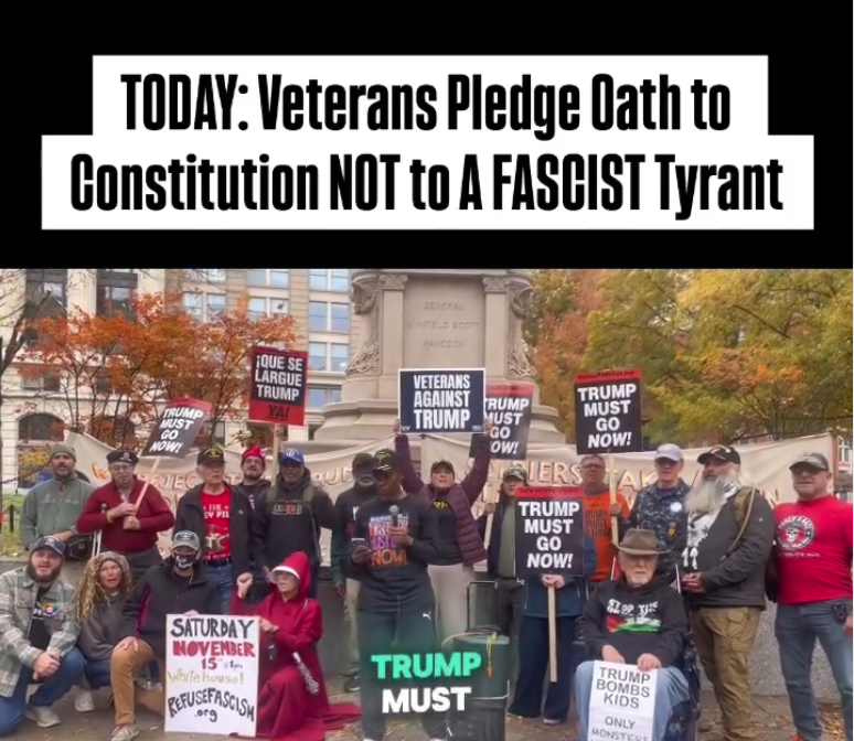 Aplausos para About Face, Veterans for Peace, RefuseFascism.org y otros que protestaron contra el fascista de la Casa Blanca y su ejército en el Día de los Veteranos esta semana. Mientras purga las filas de mujeres, miembros trans y negros, se prepara para declarar la guerra al mundo y a la población de las ciudades estadounidenses, y obliga a la lealtad a un líder fascista, es muy importante que los militares en servicio activo y los exmilitares alcen la voz