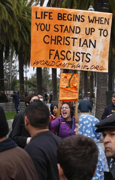 Miembros de El Mundo No Puede Esperar con pancarta en la que se leía "la vida empieza cuando enfrentas a los fascistas cristianos"