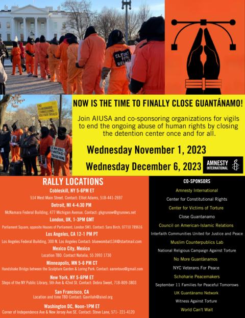 Sin embargo, si no puedes asistir a una vigilia, aún puedes participar en la petición de cierre de Guantánamo, porque vamos a conmemorar los 8.000 días de existencia de Guantánamo -como hacemos cada 100 días- con un póster que marca este vergonzoso hito y pide al Presidente Biden que cierre la prisión.