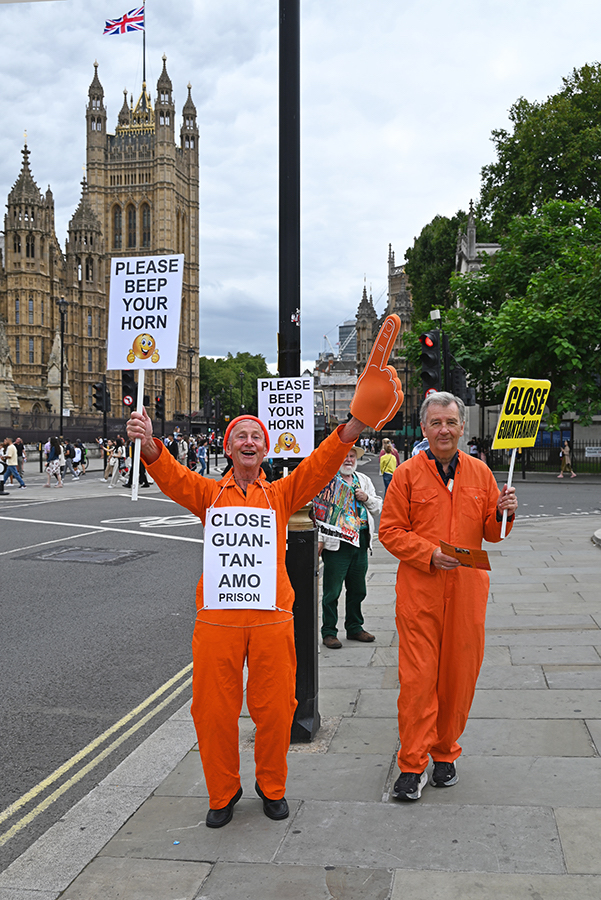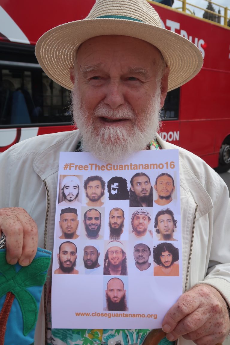 En Londres, Sara Birch y Andy Worthington sostienen los carteles de Andy en los