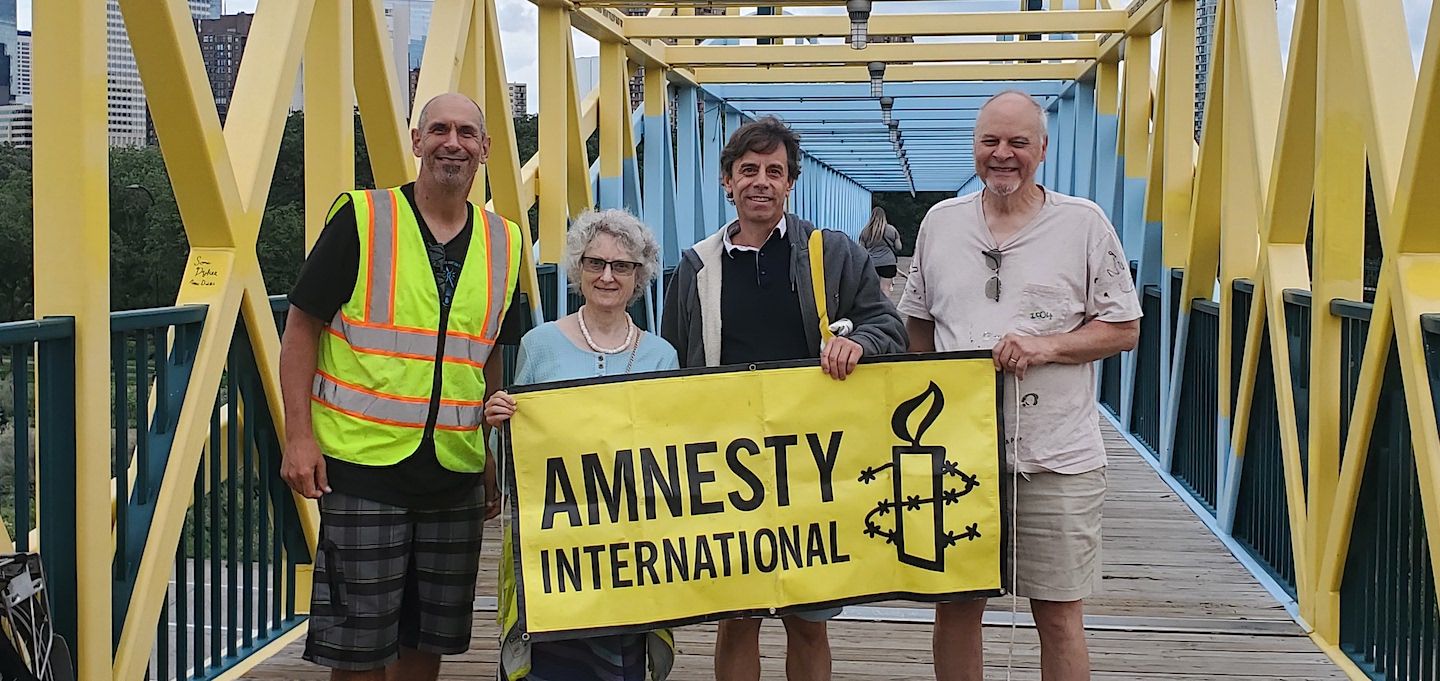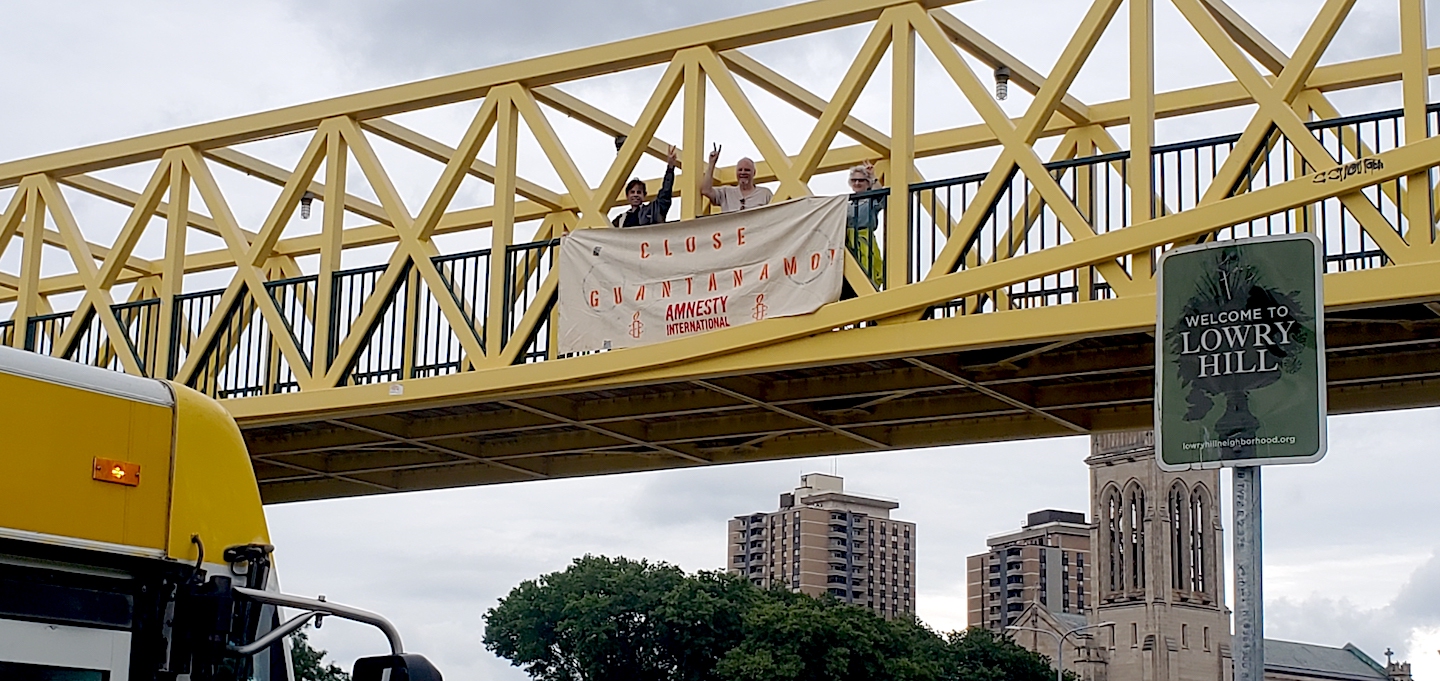 Activistas de Amnistía Internacional en el puente Handshake, entre el Jardín de Esculturas