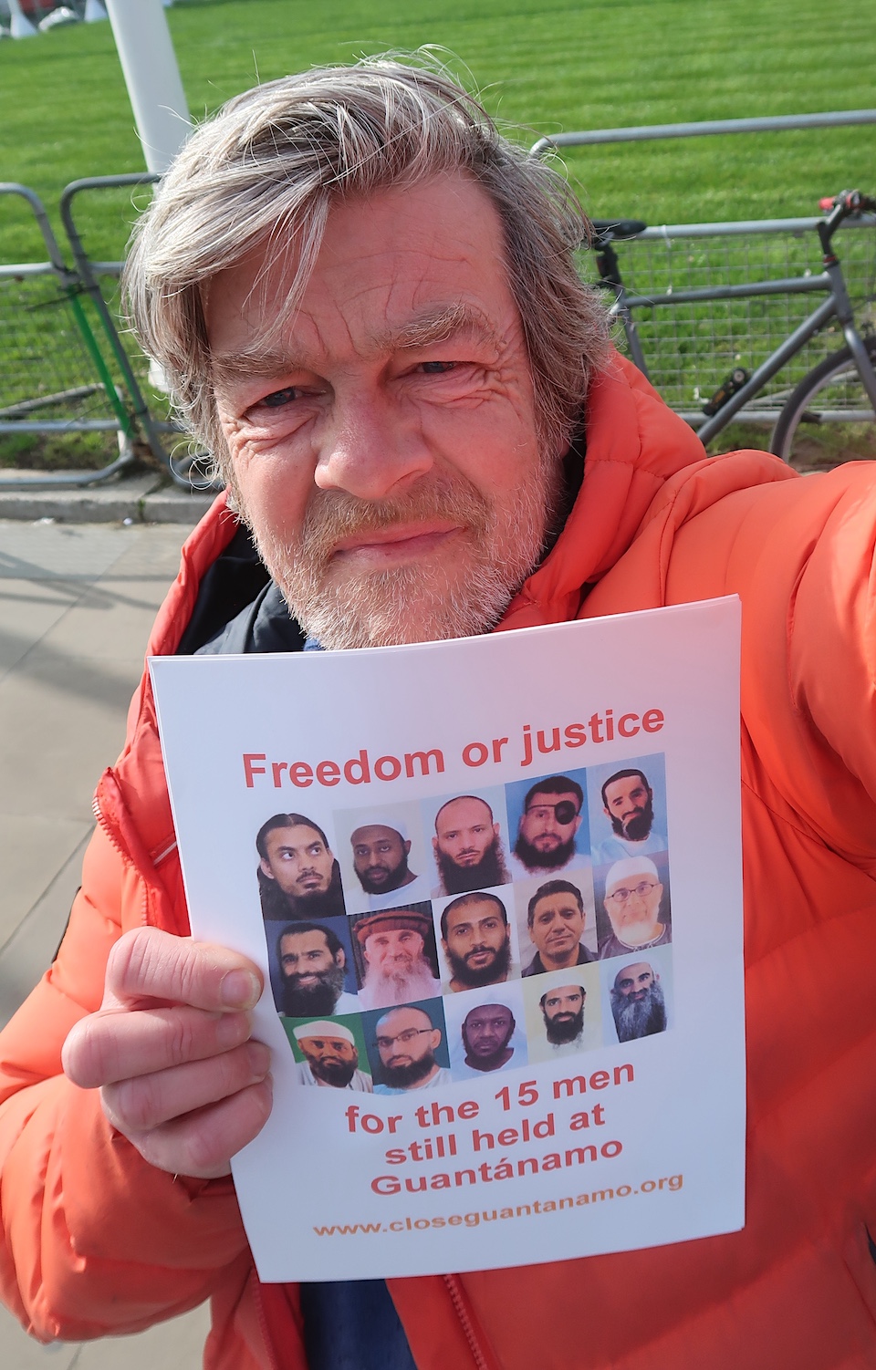 Una selfie tomada por Andy Worthington en la vigilia de Londres, en la que aparece el cartel que muestra a
