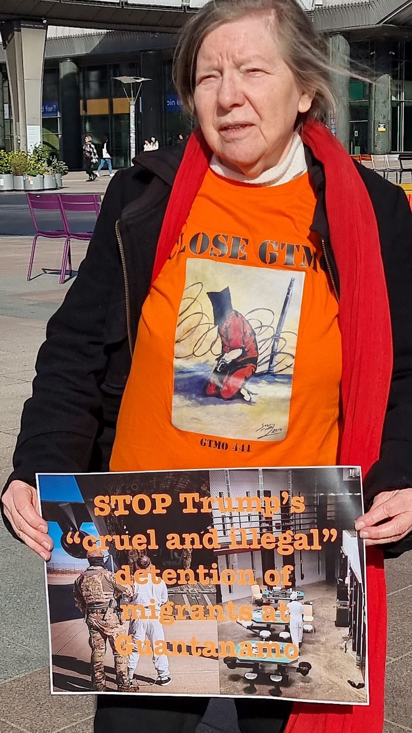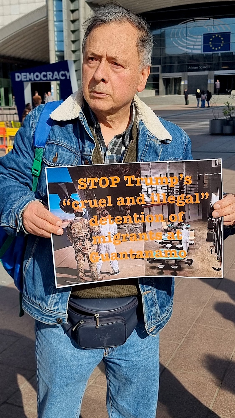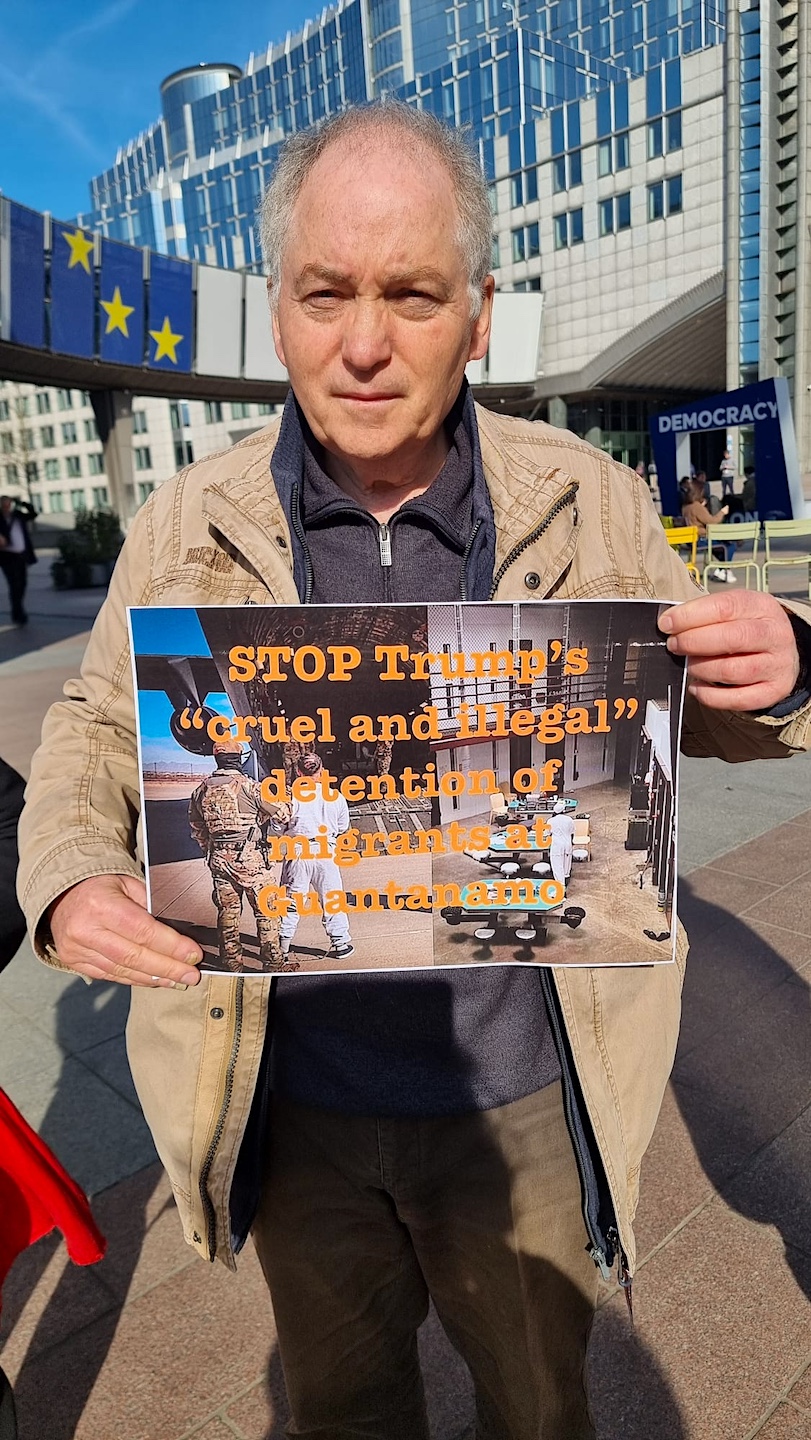 Una foto de la vigilia de Bruselas con el cartel de Andy pidiendo el fin del uso de Guantánamo por Donald