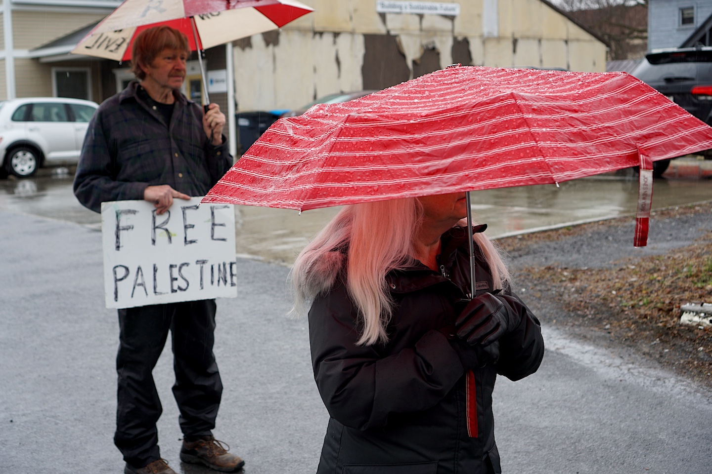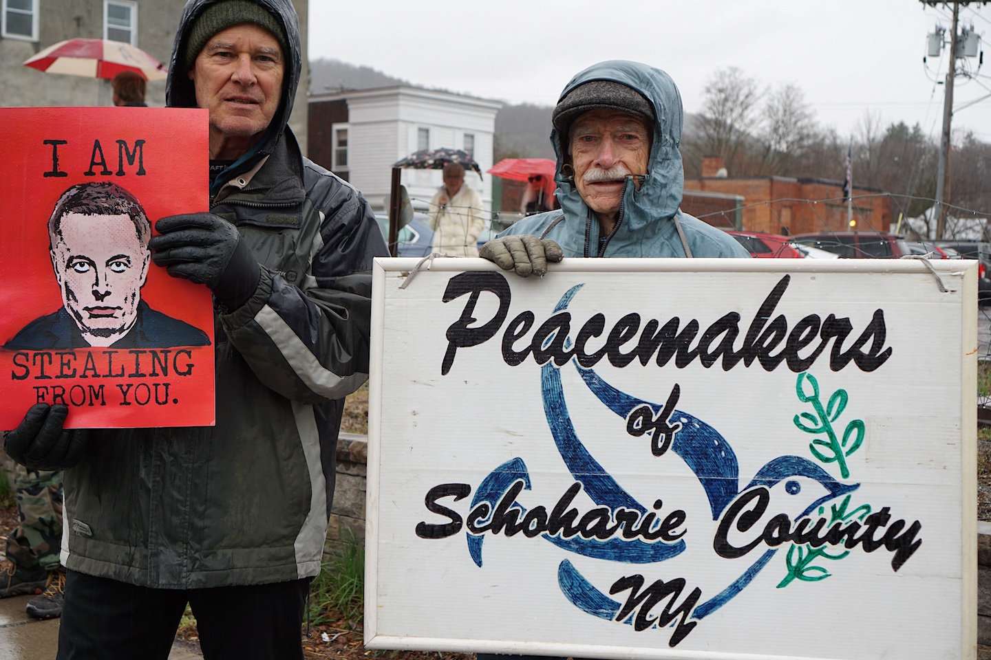 Activistas con los Peacemakers del condado de Schoharie en su vigilia en Cobleskill, NY, el sábado