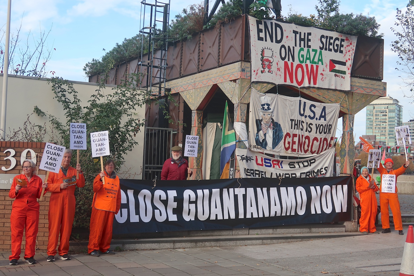 Activistas de la Red Británica de Guantánamo en la vigilia frente a la embajada estadounidense en