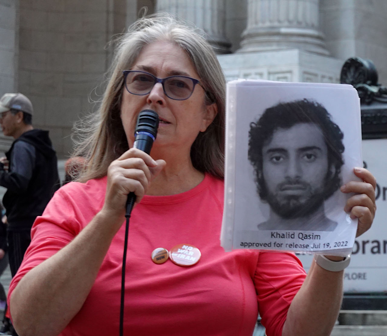 Debra Sweet, de World Can't Wait, en el micrófono en la vigilia de Nueva York, sosteniendo un póster de