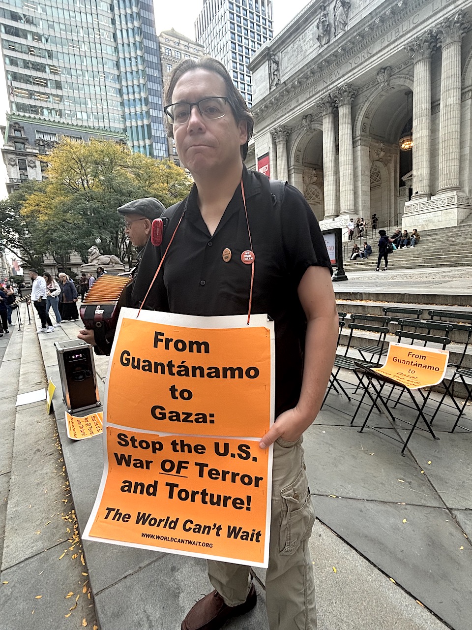 Andy Worthington con el cartel "Cierren Guantánamo" que hizo como sustituto para la vigilia