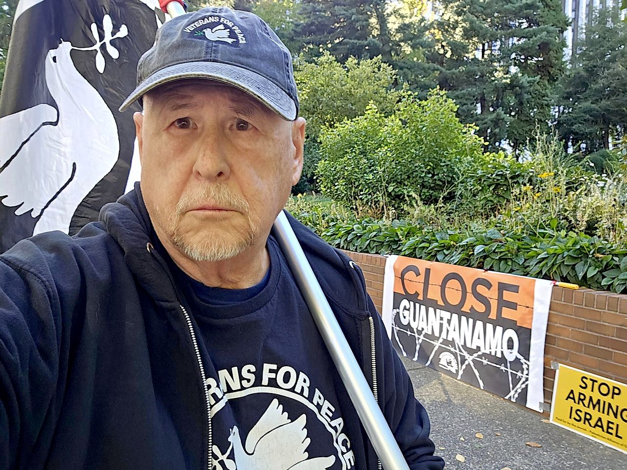 Dan Shea, del Capítulo 72 de Veterans for Peace, en la Plaza Terry Schrunk, en el centro de Portland,