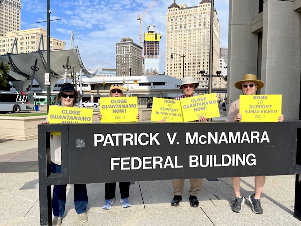 Activistas de Amnistía Internacional ante el edificio federal de la avenida Michigan, en Detroit,