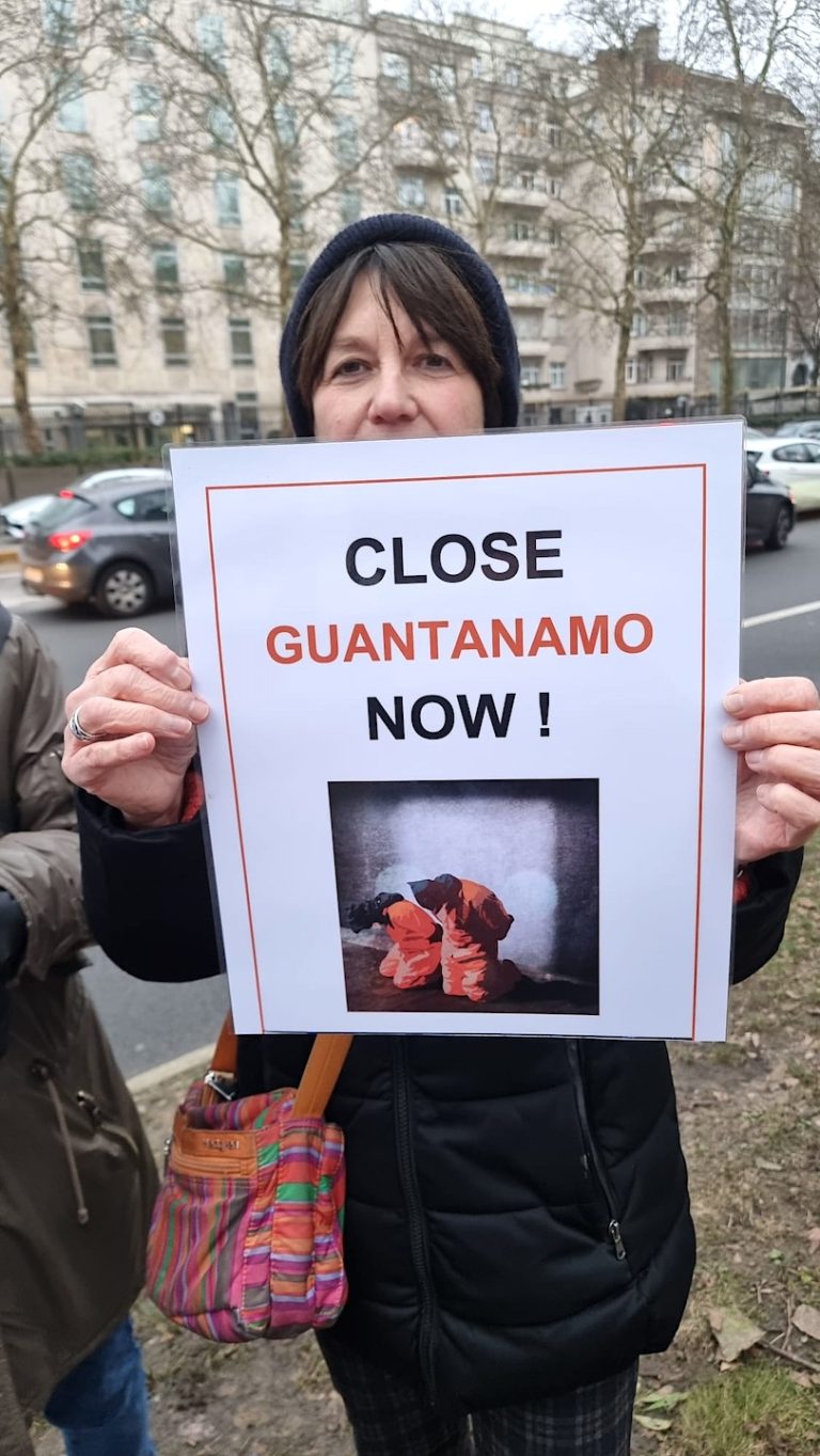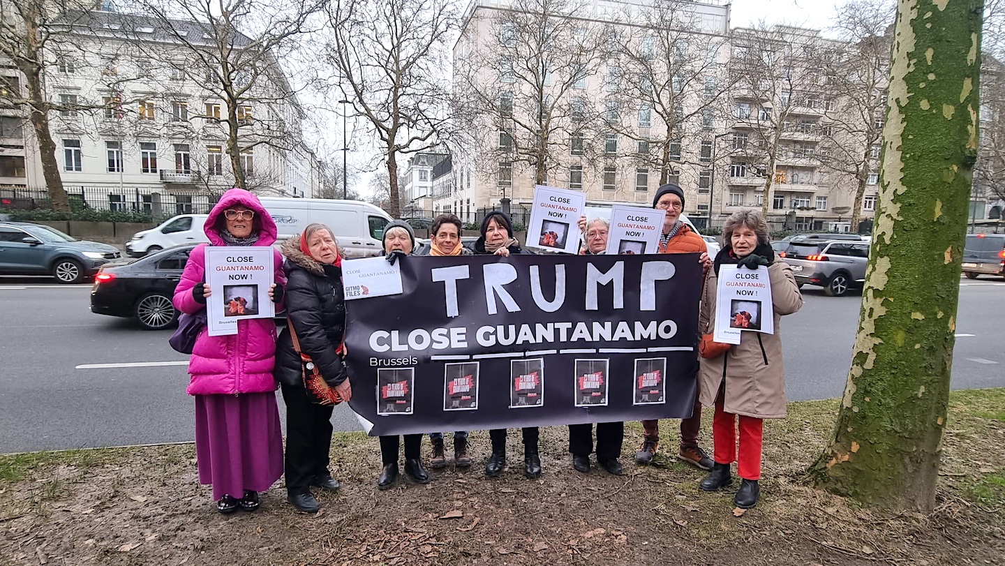 Activistas en Bruselas el 5 de febrero de 2025, con su pancarta "Cerrar Guantánamo" ajustada para