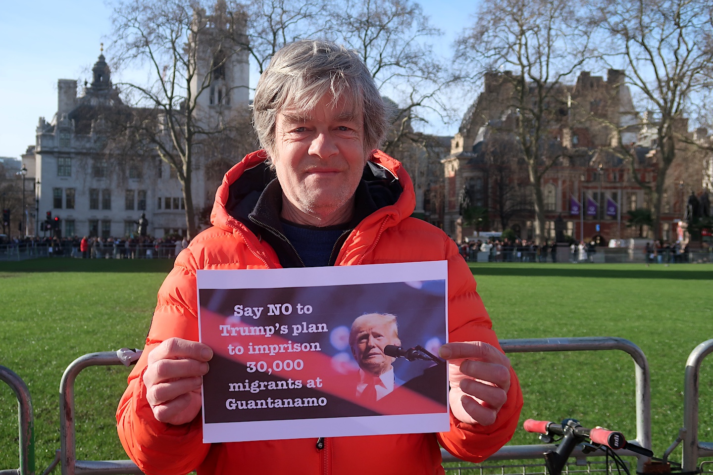 vigilia de Londres, con el cartel que hizo para protestar por el plan de Donald