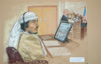 Salim Hamdan en su juicio ante la Comisión Militar, 22 de julio de 2008. Boceto de la artista del tribunal Janet Hamlin.