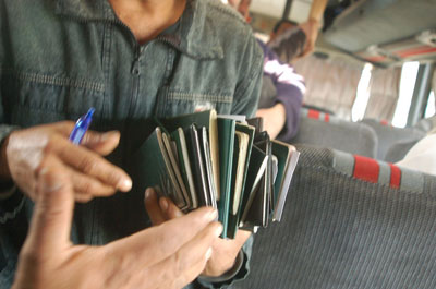 Un conductor de autobús reúne pasaportes iraquíes para preparar un viaje a Bagdad. Fotografía ©