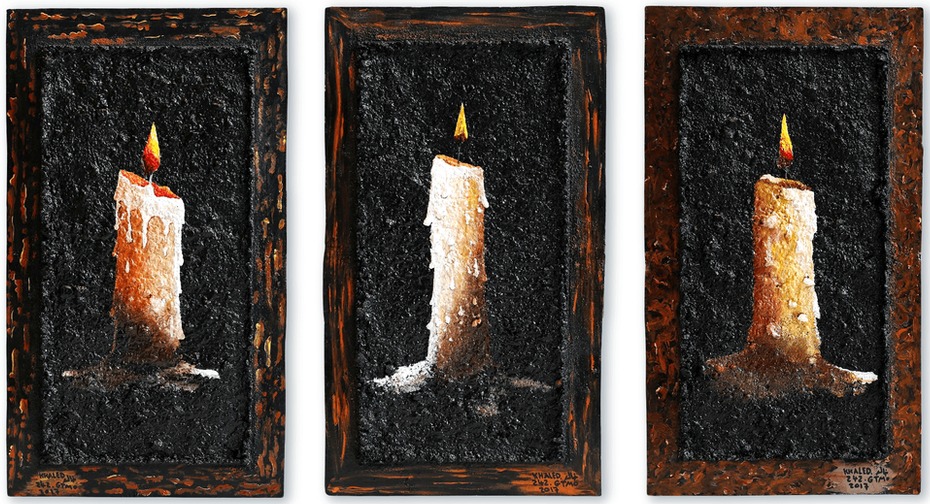 Las obras más llamativas de Khaled consisten en utilizar la grava de la propia prisión y mezclarla con cola para hacer una superficie texturizada sobre la que pinta palabras u objetos, y sus pinturas alegóricas, muy lacadas, que parecen tener siglos de antigüedad. Algunas de estas obras se reproducen en un artículo que escribí sobre él hace casi cinco años, cuando algunas de sus obras se incluyeron en una exposición de arte en la CUNY de Nueva York.