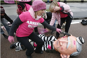 Lanzan zapatos a botarga de Bush frente a Casa Blanca